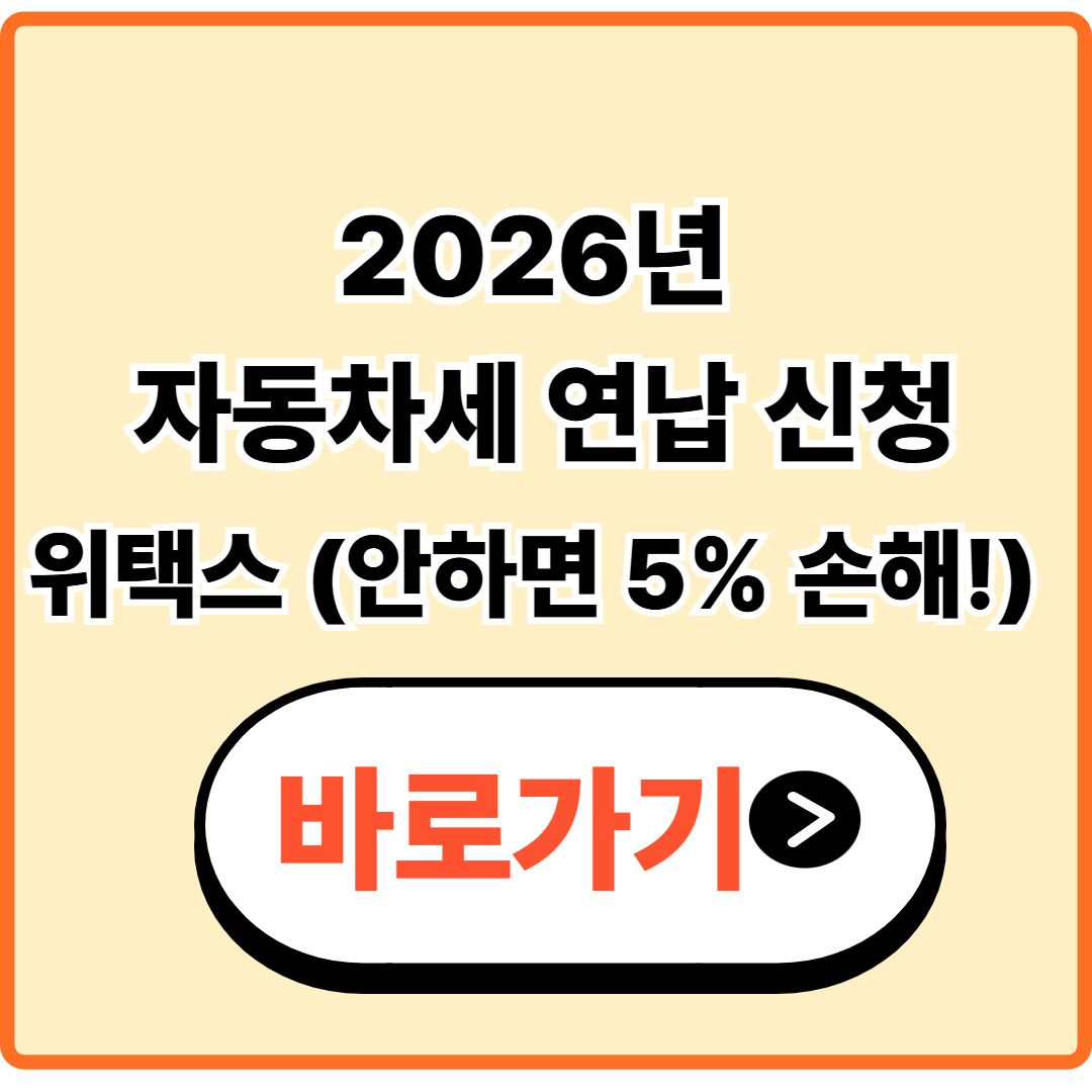 매년 나가는 자동차세, 5% 혜택받고 계신가요? 지금 2026년 자동차세 연납을 신청하면 앉은 자리에서 연봉 5% 인상과 같은 절세 효과를 누릴 수 있습니다. 1월 한 달간 주어지는 이 기회를 놓치면, 똑같은 차를 타면서도 남들보다 세금을 더 내는 억울한 상황이 발생하니 꼭 신청하시기 바랍니다. 아래의 ‘바로가기’ 버튼을 통해 ‘위택스’ 공식 홈페이지를 방문하실 수 있습니다. 2026년 자동차세 연납 '위택스' 바로가기 아래의 목차를 확인하신 후, 빠르게 정보를 확인해보시기 바랍니다. 2026년 자동차세 연납 신청을 위한 위택스 공식 홈페이지는 '바로가기' 버튼을 통해 방문하실 수 있습니다. 목차1. 2026년 자동차세 연납 신청 기간 및 5퍼센트 할인 혜택 핵심 정리 2. 자동차세 연납 제도의 ..