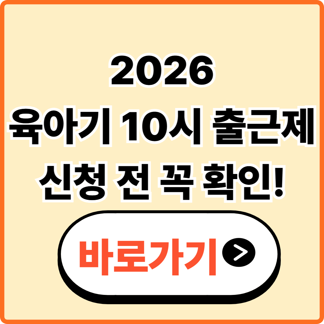 육아기 10시 출근제는 단순한 배려 제도가 아니라 법적으로 보호되는 근로자의 권리입니다. 그럼에도 불구하고 많은 부모들이 “회사에서 싫어하면 어떡하지”, “인사평가에 불이익이 있지 않을까”라는 걱정 때문에 육아기 10시 출근제를 신청하지 못하고 있습니다. 그 결과 매달 줄일 수 있었던 교통비, 돌봄비, 시간 비용을 그대로 감당하게 됩니다. 따라서 2026 육아기 10시 출근제에 대한 공식 내용을 꼼꼼히 확인해보시는 것을 추천드립니다. 육아기 10시 출근제 공식 내용 육아기 10시 출근제는 아이를 키우는 부모의 삶의 질을 직접적으로 바꾸는 제도이며, 제대로 활용할 경우 연간 수백만 원에 해당하는 시간·비용 절감 효과를 기대할 수 있습니다. 아래의 목차를 확인하신 후, '바로가기' 버튼을 통해 공식 홈..